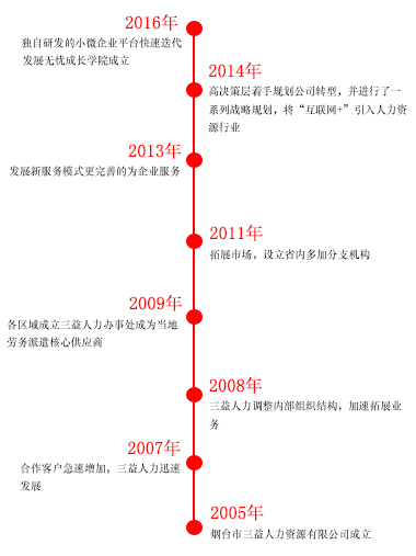 2008年8月,鄄城縣三益人力資源開發有限公司正式成立,鄄城公司的成立為公司今后的發展發揮重要作用。煙臺三益人力資源有限公司總部于2009年07月06日在煙臺工商局注冊成立。在公司發展壯大的10年里,我們始終為客戶提供好的產品和技術支持、健全的售后服務。公司先后在三十里堡、科信大廈、業達智慧谷、天宇市場開設了店鋪。2017年3月,三益威海分公司成立,大大拓寬了我們的國內市場。